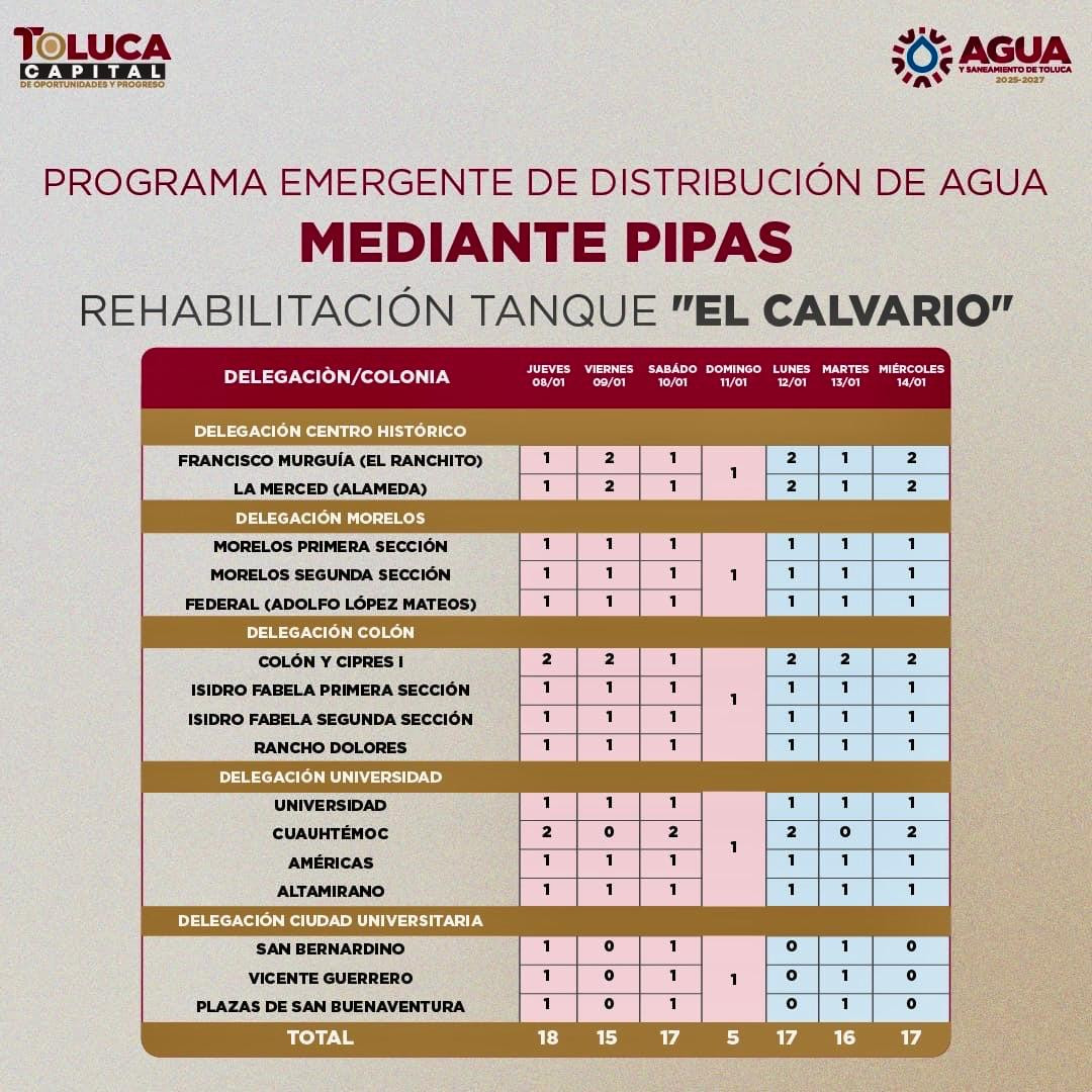 Además, recordó que las familias cuentan con el servicio de pipas que el Organismo Agua y Saneamiento de Toluca ofrece de forma gratuita para apoyar a la ciudadanía para lo cual deberán reportar la falta de suministro al número 722 275 5700.