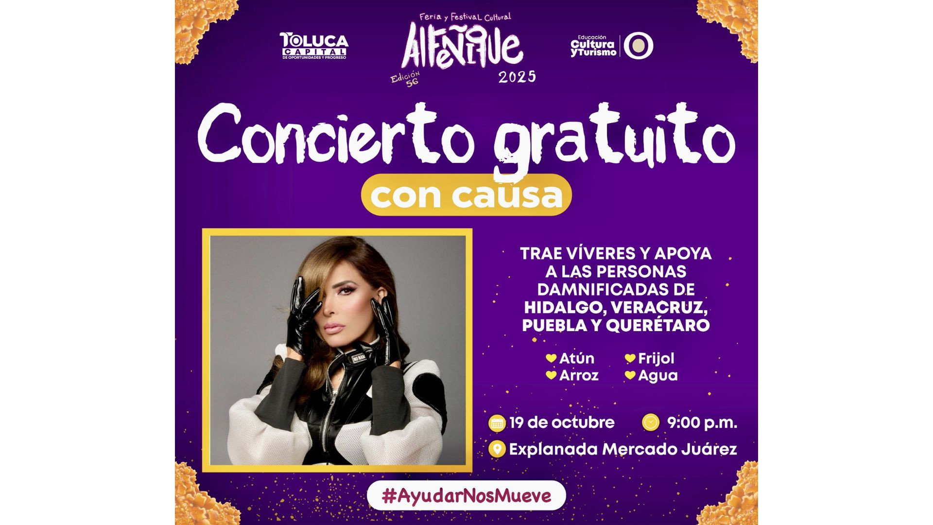 Acompaña a la artista mexicana en el concierto en el mercado Juárez que forma parte de la Feria y Festival Cultural del Alfeñique 2025 y dona esperanza para los hermanos afectados por las lluvias de los estados de Veracruz, Hidalgo, Puebla, Querétaro y San Luis Potosí.